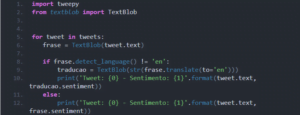 Além de bibliotecas mais operacionais, você encontra bibliotecas relacionadas a várias aplicações como para análise de sentimento do texto, detectar pessoas em uma imagem entre outras. Apesar de serem tarefas mais complexas, a facilidade para utilizá-las é impressionante. No exemplo abaixo, o código usado traduz os tweets para inglês e depois aponta o provável sentimento do post, se é positivo ou negativo.